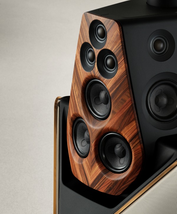 Monarch-udgaven er et sandt udstillingsvindue for den klassiske danske designarv. Den er bygget op med vinklede og buede lameller i rosentræ, der omfavner aluminiumskabinettet og skaber en 360-graders visuel rytme. Samlingerne i træet har endda en ret unik, diskret lysdetalje i fronten. Kontrasten mellem det varme træ og de okkerfarvede aluminiumskroner i toppen giver højttaleren et meget balanceret look, alt imens semitransparente tekstilfelter lader dig ane de vilde højttalerenheder inde bagved.