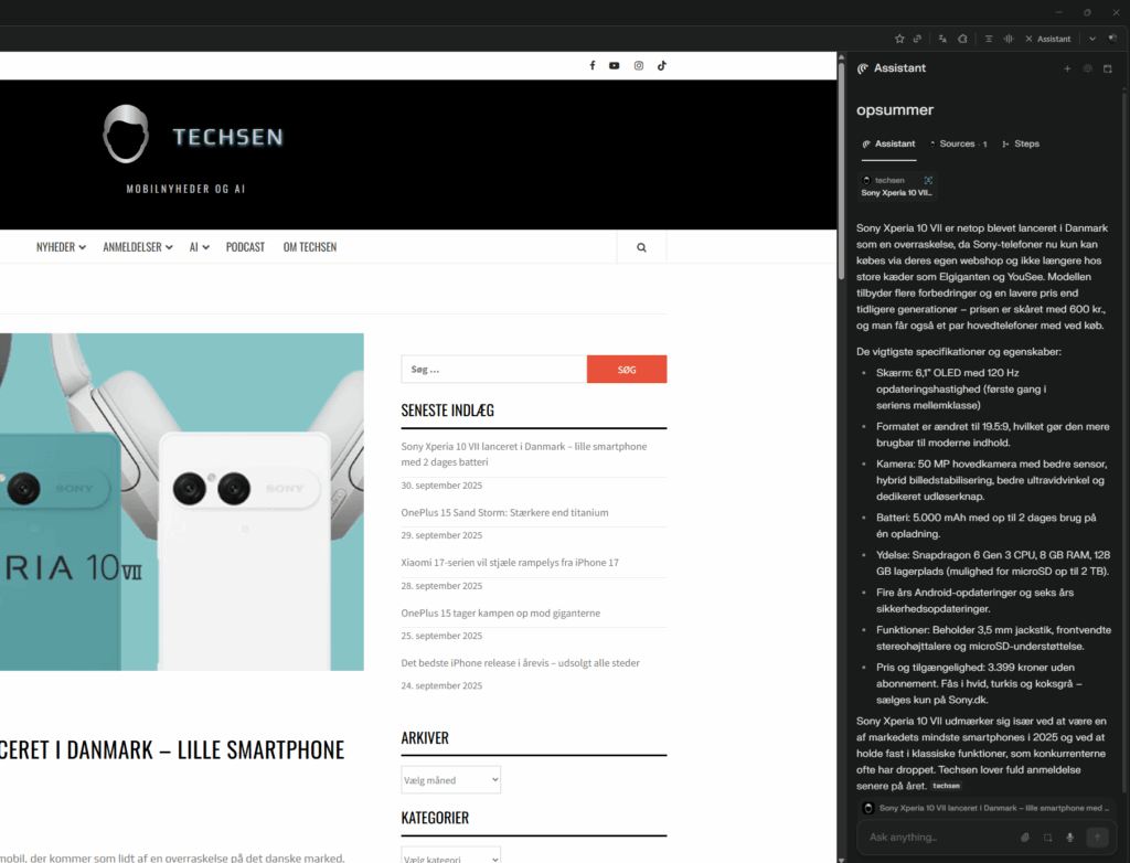 Her fik jeg den til at opsummere vores artikel: Sony Xperia 10 VII lanceret i Danmark – lille smartphone med 2 dages batteri