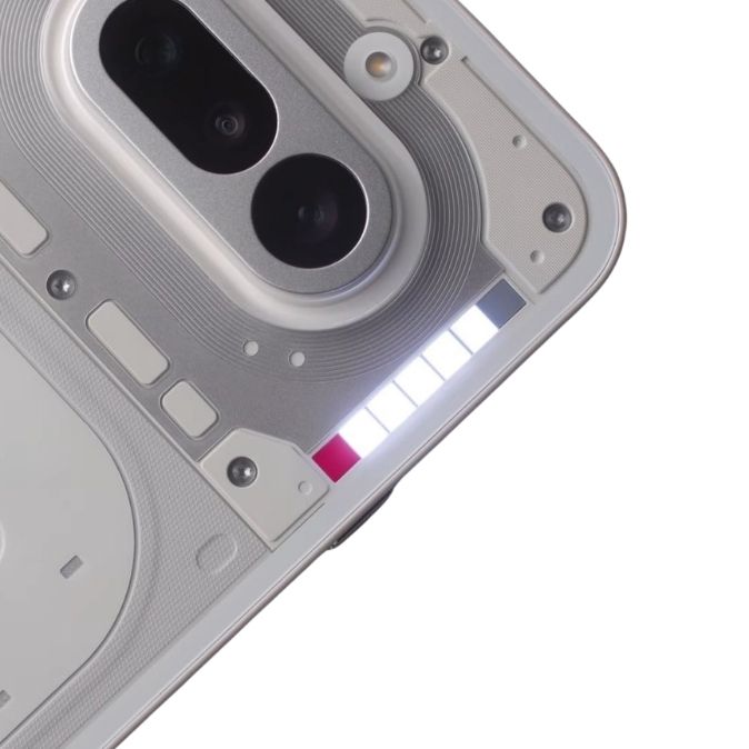 I stedet introducerer Nothing en nydesignet “Glyph Bar”, der er placeret diskret i højre side. Den består af syv små, firkantede mini-LED-lys i forlængelse af hinanden, afsluttet med en lille rød firkant i bunden.
